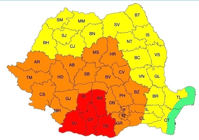În județele Dolj, Olt, Teleorman, Giurgiu, Ilfov, în sudul județelor Vâlcea, Argeș, Dâmbovița, precum și în municipiul București, valul de căldură va fi intens și persistent, iar temperaturile vor fi deosebit de ridicate, pentru a cincea zi consecutiv. Temperaturile maxime vor fi de 38...39 de grade, iar cele minime, se vor situa în jurul a 20 de grade (nopți tropicale). Va fi caniculă și disconfort termic deosebit de accentuat, iar indicele temperatură-umezeală (ITU) va depăși pragul critic de 80 de unități.