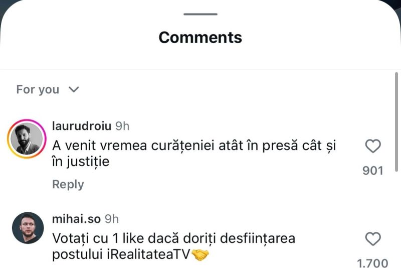 O altă persoană spune: „Votați cu un like dacă doriți desfințarea postului Realitatea TV”.