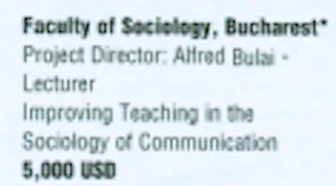 George Soros a finanțat și facultatea de Sociologie din cadrul universității București cu două granturi. Managerul de proiect era Alfred Bulai și el a decis cum sunt cheltuiți cei 8 mii de euro.