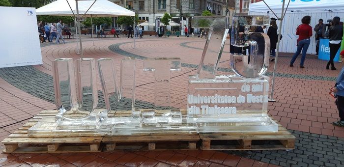 Tinerii absolvenț au fost conduși apoi pe ritmuri muzicale către Piața Libertății, unde îi așteptau diferite standuri, dar și o impresionantă sculptură de gheață care le amintea tuturor că în acest an Universitatea de Vest din Timișoara împlinește 75 de ani de existență.