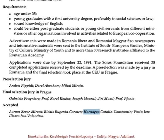 Unul dintre oamenii cheie prinși în rețeaua lui Soros este Cătălin Harnagea. Potrivit raportului din 1992, fostul șef al Serviciului de Informații externe între 1997 și 2001, a beneficiat de o bursă de studii la Universitatea Central Europeană, unde toate costurile au fost suportate de oamenii lui George Soros.