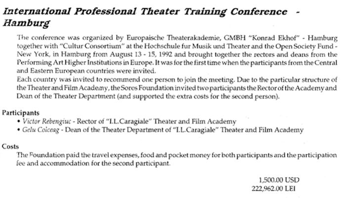 Rebengiuc a participat și la o conferință de teatru și film în 1992 la Hamburg, unde cheltuielile ar fi fost plătite de Soros. Pentru acest eveniment, Rebengiuc ar fi beneficiat de 1.500 de dolari și 222 de mii de lei.