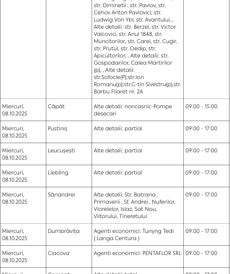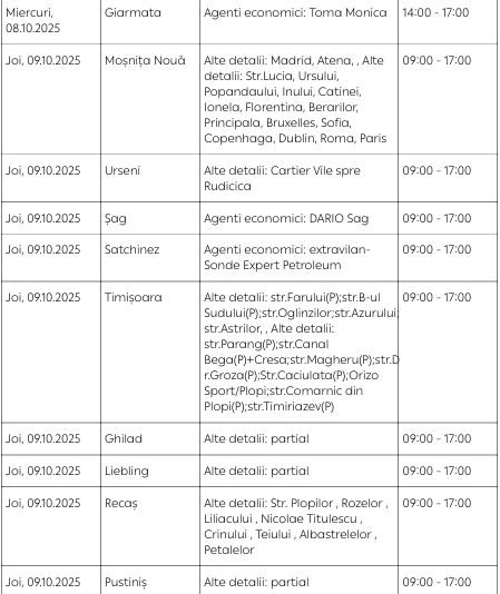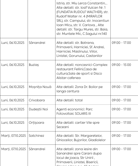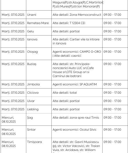 ZECI DE LOCALITĂȚI DIN JUDEȚUL TIMIȘ RĂMÂN FĂRĂ CURENT ÎN PERIOADA 6-10 OCTOMBRIE