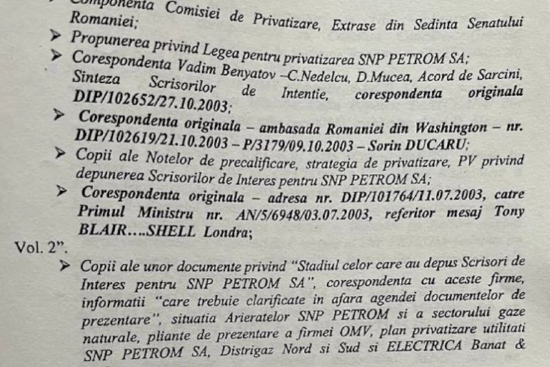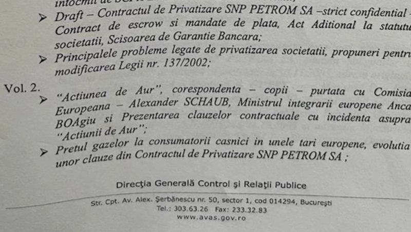 Volumul 2, cu Acțiunea de aur, corespondență, copii comunicare cu Comisia Europeană , ministrul integrării europene Anca Boagiu și prezentarea clauzelor contractuale cu incidență asupra Acțiunii de aur, prețul gazelor la consumatori casnici în unele țări europene, componența Comisiei de privatizare, propunerea legii de privatizare, corespondența dintre Vadim Benyatov, Nedelcu, Mucea, corespondența originala intre ambasada României la Washington - Sorin Ducaru, corespondența originală către primul ministru referitor mesaj Tony Blair ...Shell Londra.