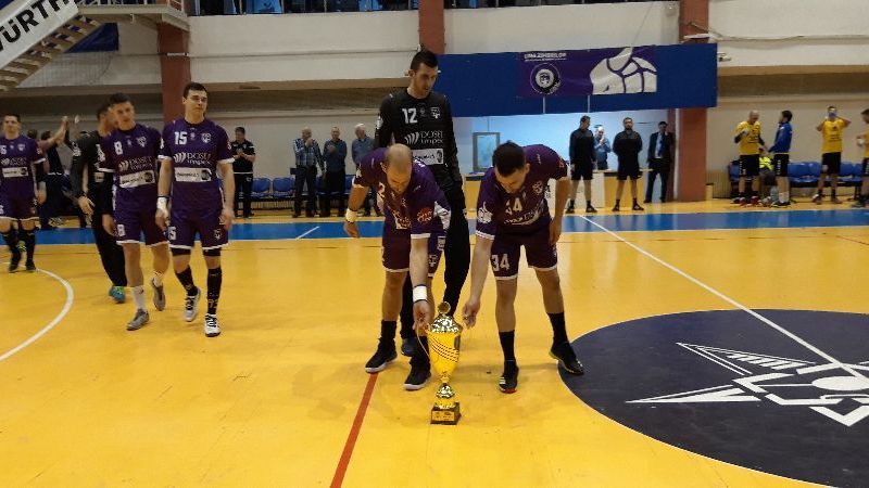 Handbaliștii timișoreni au intrat apoi în sală, iar Andrei Păiuș și Cristian Fenici au fost cei care au adus trofeul în fața fanilor. Fiecare dintre componenții lotului timișorean a fost aplaudat de cei care au venit să asiste la duelul din etapa a 20-a.