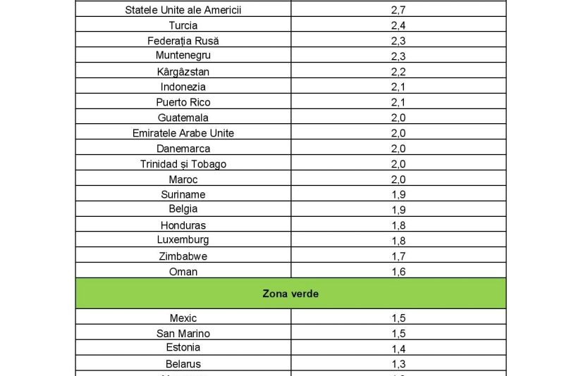 - în zona galbenă vor intra: din zona roşie, în urma scăderii incidenţei, Suriname şi Insulele Feroe şi din zona verde, în urma creşterii incidenţei, Franţa, Belgia, Israel, Statele Unite ale Americii, Islanda, Honduras, Aruba şi Saint Marteen;