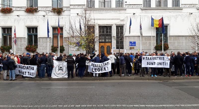 Asociația Banat Taxi spune că din cauza concurenței neloiale taximetriștii își văd amenințate locurile de muncă. Oamenii au decis sa protesteze mai întâi în fața primăriei și cer ajutoprul autorităților locale."Am venit să ne susținem cauza, adică aplicarea legii în mod egal pentru toți transportatorii. Nu vrem o dublă legiferare, adică o lege pentru băieții deștepți, băieții privilegiați, care dau șpăgi și cunoștințe, și una pentru cetățenii onești care plătesc taxe și respectă legea. Am fost în 20 decembrie, după hotărârea Curții de Justiție a Uniunii Europene, care a statuat clar că aplicațiile informatice, transportatorii ilegali, nu sunt aplicații informatice, ci sunt transportatori. Deci, pe cale de consecință trebuie să se supună legii transporturilor în țările în care operează. Noi avem o lege foarte clară, foarte bine reglementată, numai că băieții deștepți înțeleg că nu trebuie să o respecte. De asta am ieșit, că în 20 decembrie ni s-a promis de către guvernul României că se va scoate sintagma 'în mod repetat', ca cei care sunt prinși făcând transport ilegal de persoane contra cost să poată fi sanctionați. Asta am cerut domnului chestor IPJ Timis. Am depus o listă cu 248 de transportatori ilegali, mașini care nu au autorizație, să îi verifice. Nu le-am cerut să le taie capul, dar măcar un avertisment... Noi nu ne executam obligațiile doar dacă vrem când ieșim la lucru sau doar dacă ne place. Încercăm să facem din taximetrie o meserie frumoasă, să ridicăm standardele. Ne-am făcut aplicații informatice, am schimbat mașinile de la Mercedes-uri, BMW-uri până la ultimele tipuri de Logan. Această concurență neloială e menită de a ne discrimina, de a ne produce pagube și de a ne pune într-o lumină proastă... Nouă nu ne e frică de concurență. Noi cerem sa fim egali în fața legii", a declarat Adrian Juganaru purtator de cuvant Asociatia Banat Taxi.