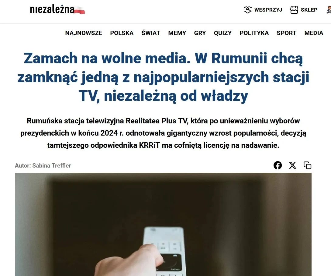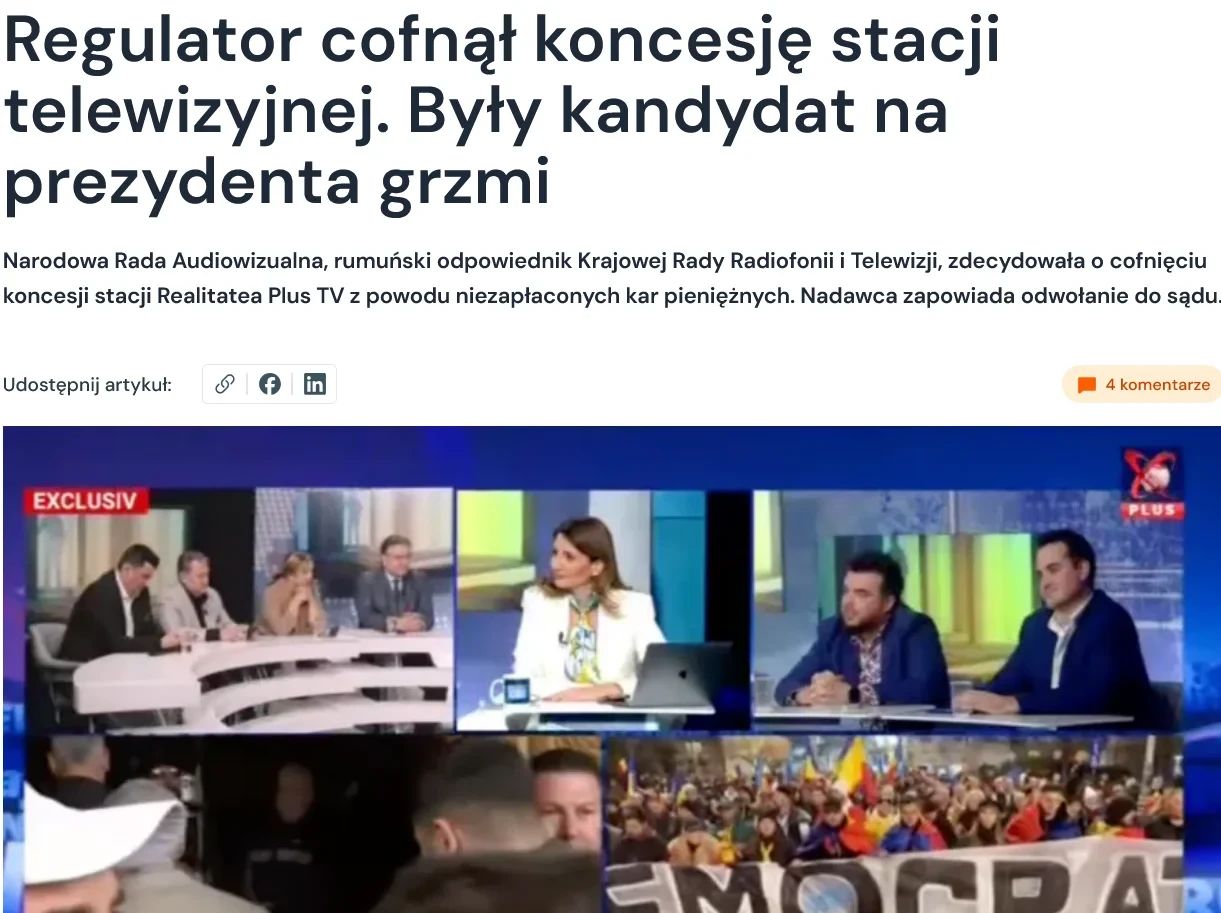 A fost retrasă licența unui post de știri independent din România. Acesta prezenta informații despre anularea primului tur al alegerilor prezidențiale din 2024.În decembrie 2024, întreaga Europă a fost șocată de situația din România, unde primul tur al alegerilor prezidențiale, câștigat de Călin Georgescu, a fost anulat din cauza unor presupuse manipulări electorale desfășurate în afara țării. Printre acuzații s-a numărat și finanțarea de către Rusia a conținutului pro-Georgescu de pe TikTok. Cu toate acestea, conform investigațiilor jurnaliștilor, campania a fost finanțată de Partidul Național Liberal Român, partid conservator-liberal. Acum se dovedește că unul dintre posturile de televiziune, Realitatea Plus, care a relatat subiectul, și-a pierdut licența de emisie.