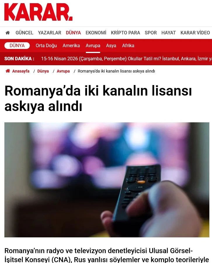 Consiliul Național al Audiovizualului (CNA), autoritatea de reglementare în domeniul radiodifuziunii și televiziunii din România, a suspendat licențele de emisie ale unui post de televiziune și unul de radio cunoscut pentru discursurile pro-ruse și teoriile conspirației. S-a anunțat că decizia a fost luată deoarece ambele instituții nu și-au achitat amenzile aplicate pentru difuzarea de conținut anti-UE și pro-rus. (B.T.I.)