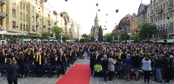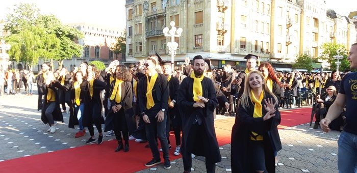 Îmbrăcați în robe negre, eșarfe galbene la gât și tocile pe cap, sute de studenți de la toate facultățile Universității de Vest din Timișoara s-au adunat în centrul orașului pentru cursul festiv.